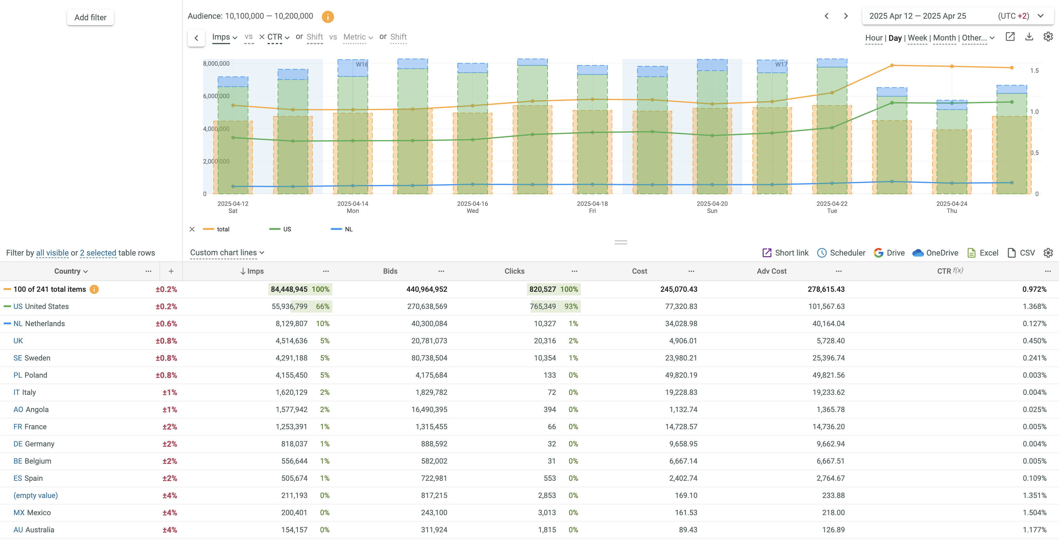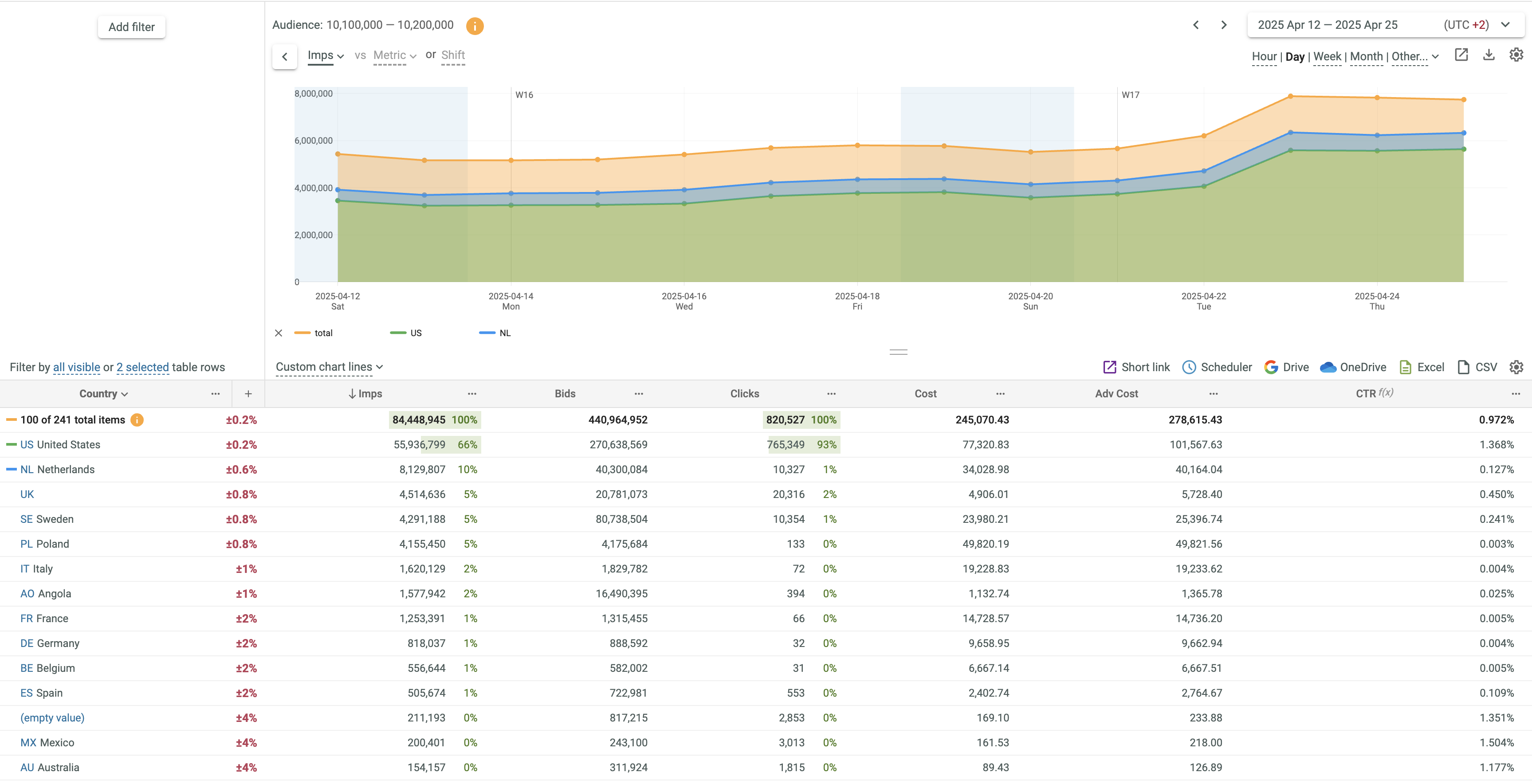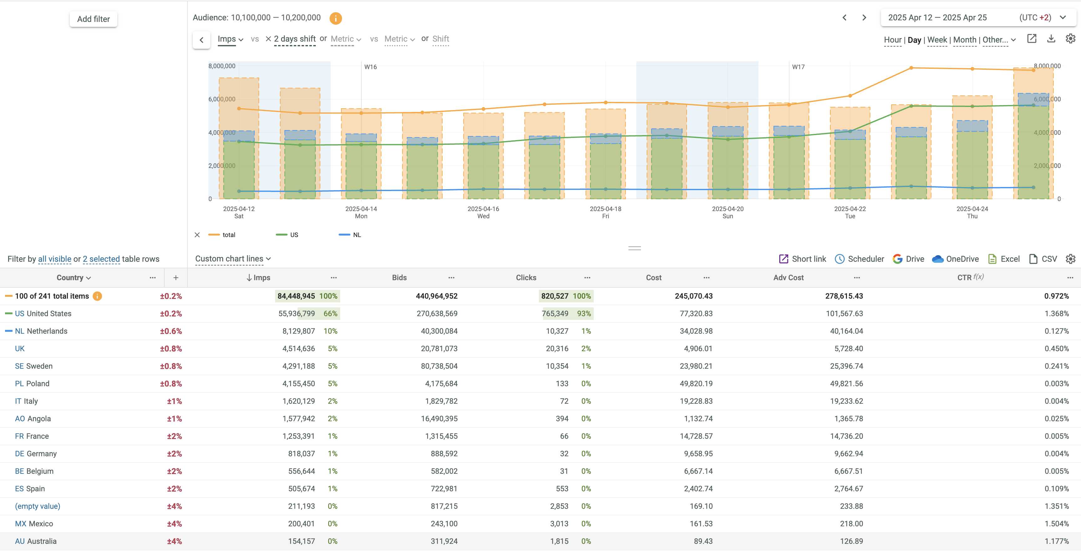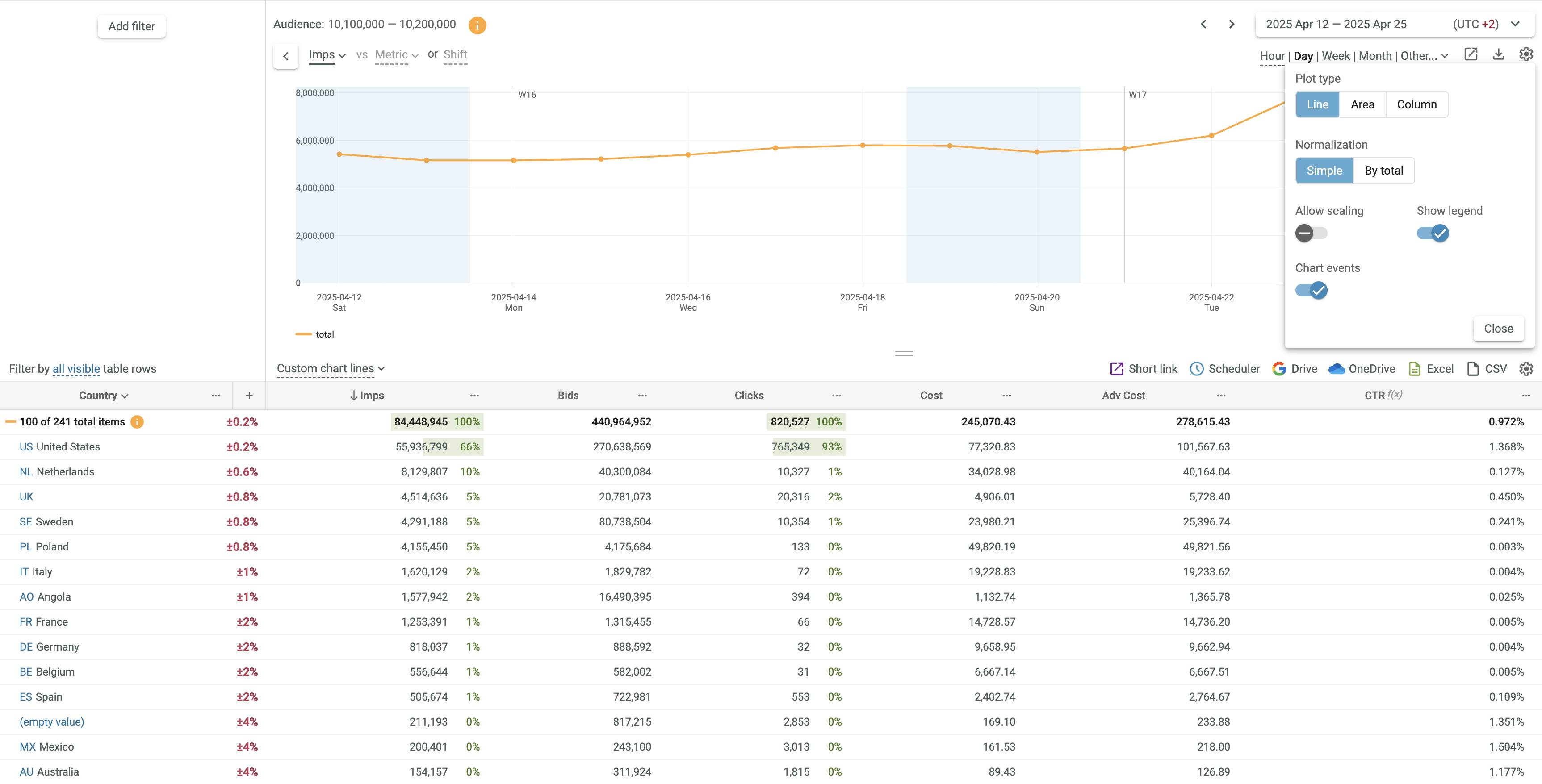 - If 2 metrics or time shift are selected, Lines and Line + Column options only are supported. The first metric is always displayed as Line. The second metric can be displayed as Line or Column. You can swap metrics by clicking the vs link.